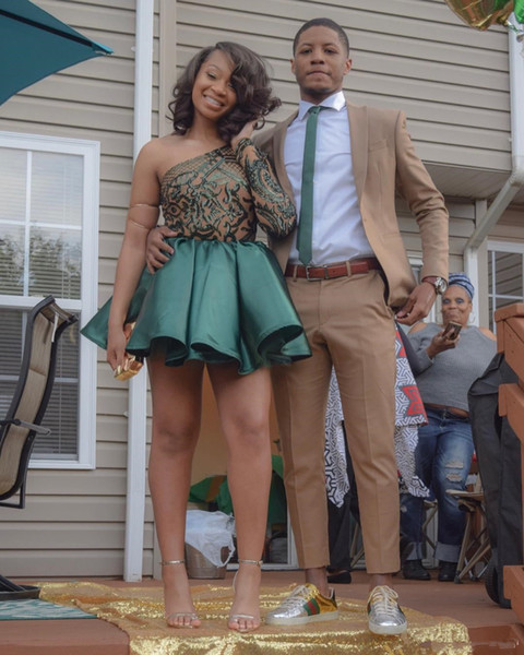 African A Line Hunter Lace Homecoming Dresses One Shoulder Long Sleeve Short Prom Gowns Cheap Pleated Satin Cocktail Dress
