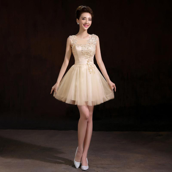 Champagne Scoop Neck Lace Appliqued Short Bridesmaid Dress 2015 Lace Up Bridesmaid Gowns vestido de festa longo