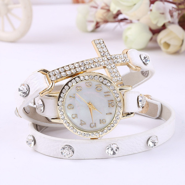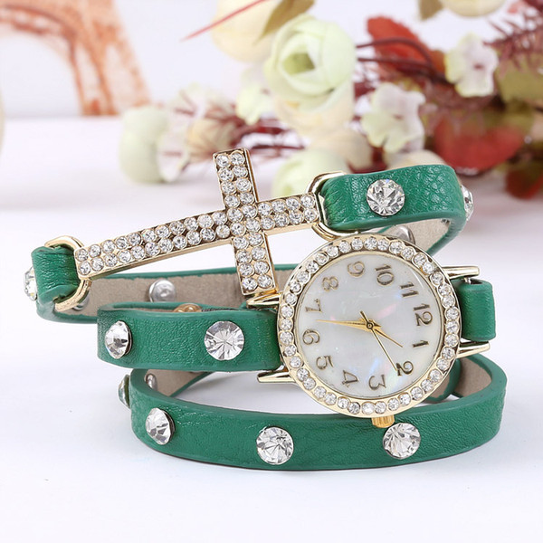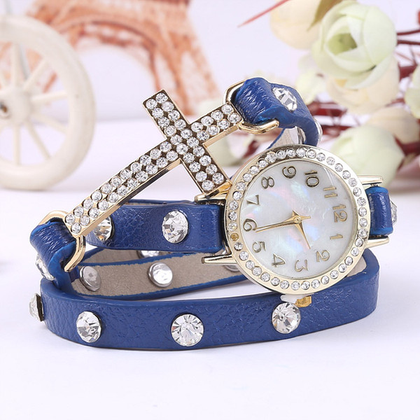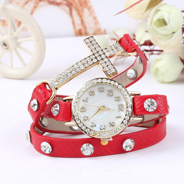 free shippng 2015 New women vintage drill bracelet women watches with cross,fashion leather strap quartz watches,women dress watches