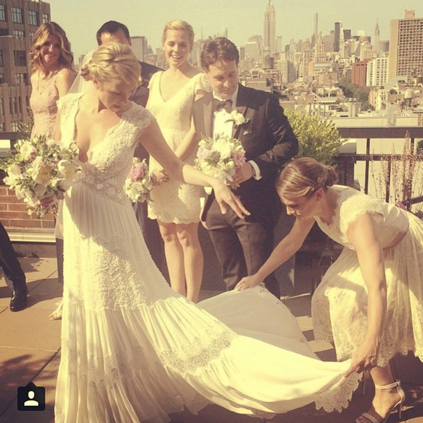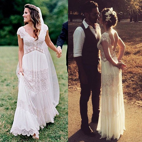 Vintage lihi hod Wedding Dresses Sheer Deep V Neck Backless Bohemia Lace Applique Wedding Gowns Chiffon Court Train Long Bridal Dress