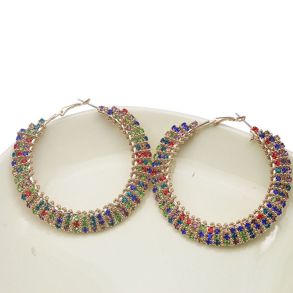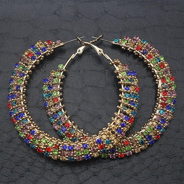 Big Ethnic Women Colorful Artifical Crystal Earrings Golden Hoop Earrings 70mm Diamater Luxury CZ Big Stud Earrings Brincos