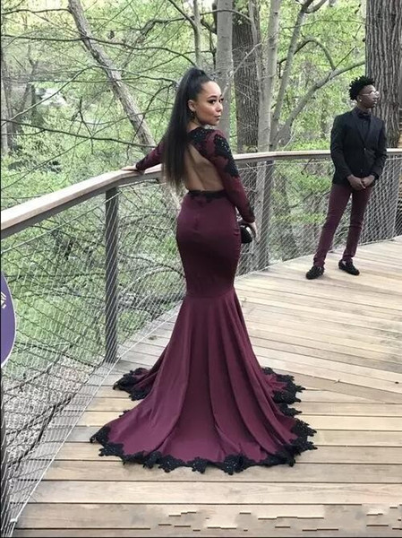 Fall Winter Burgundy Mermaid Prom Dresses Long Sleeves Sweep Train New Sexy Backless Lace Sequins Evening Gowns