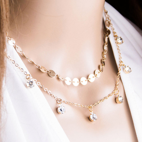 New Simple Fashion Double Layer Copper Sequins Choker Necklace for Women Chocker Collar Crystal Pendant Necklaces Jewelry Gift