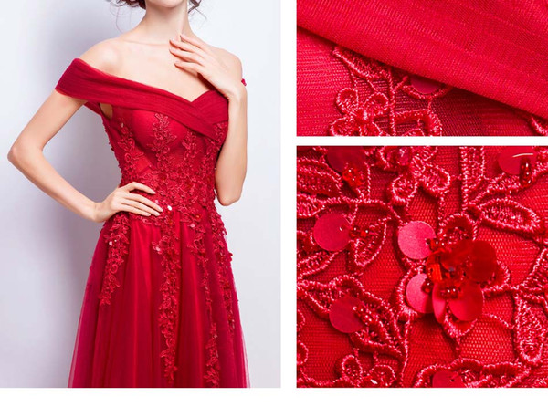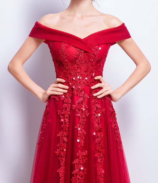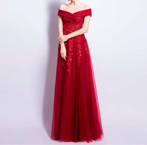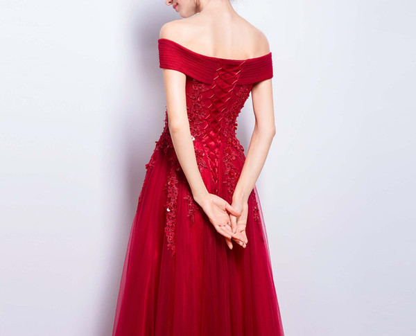Dark Red Evening Dress Sexy Off the Shoulder Lace-up Back Floor Length Applique with Sequins Beads Prom Dress