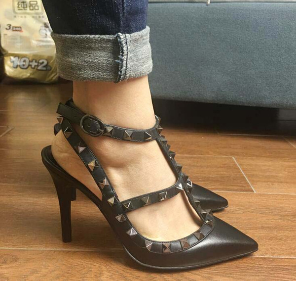 Designer Pointed Toe 2-Strap with Studs high heels Patent Leather rivets Sandals Women Studded Strappy Dress Shoes valentine high heel Shoes