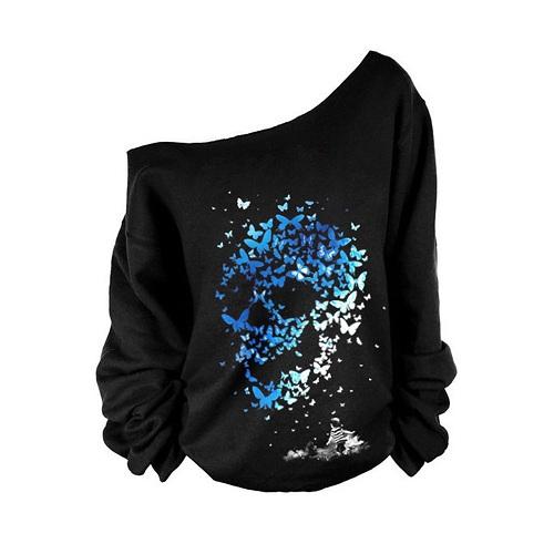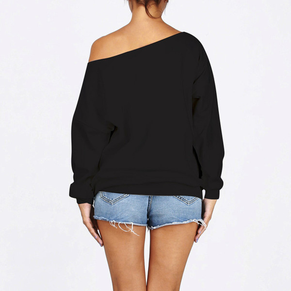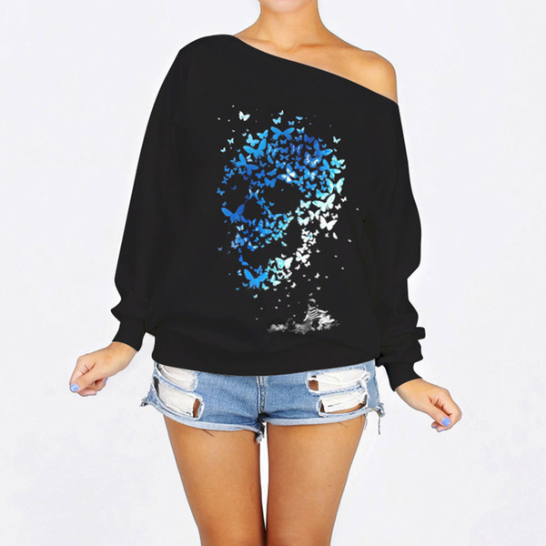 2018 Autumn Winter Harajuku Black Hoodies Women 3D Skull Print Oblique Collar Sweatshirt One Off Shoulder Loose Casual Hoodies