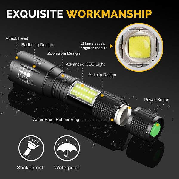 LED flashlight side COB lamp design T6/L2 8000 lumens Zoomable torch 4 light modes for 18650 battery + charger +gift