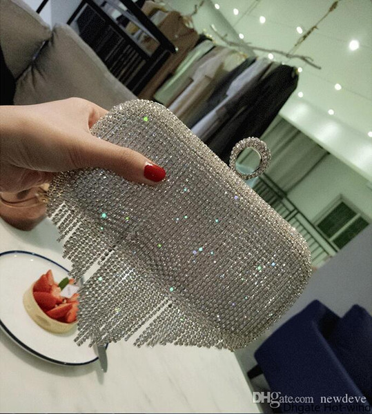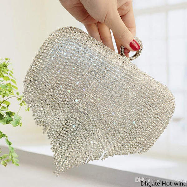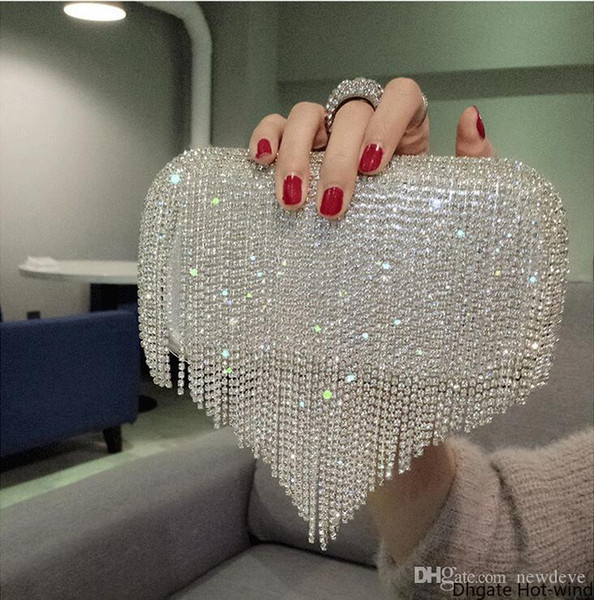 New Rhinestones Heart Tassel Women Clutch Bags Diamonds Finger Ring Evening Bags Crystal Wedding Bridal Handbags Sliver